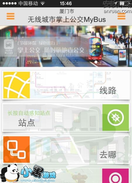 1、打开无线城市掌上公交,进入无线城市掌上公交主界面后,主界面当中会有一些功能选择,包括公交线路,自动感知当前公交站点、按地点查询等功能,如下图所示。