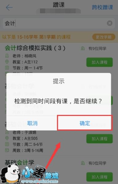 6、这里的提示就是说明我们现在上的课程和我们蹭课的课程有时间的冲突,这里我们可以选择其他的课程,来错过时间,如果没影响的就点击确定就可以了。