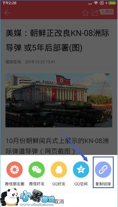 3、在分享中即可看到QQ和微信的分享,却看不到微博的分享,这时我们可以复制链接,然后进行到自己的微博界面将链接地址粘贴到发表新微博内容框中,然后点击发表即可。