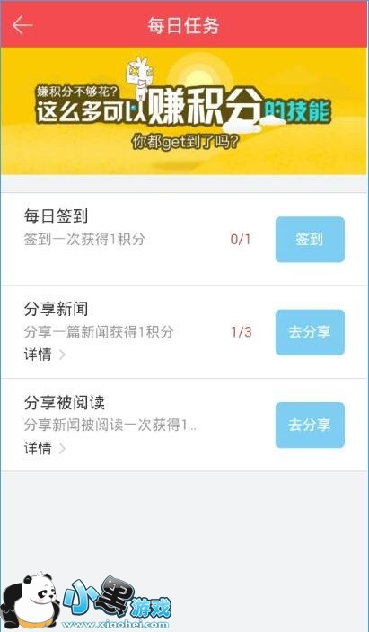 4、在每日任务中可以通过每日签到、分享新闻、分享被阅读来换积分;