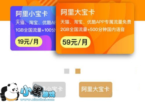 阿里宝卡系列产品依然分为大宝卡与小宝卡两种套餐,价格分别为19元/59元,19元的阿里小宝卡内含1GB全国流量+100分钟国内语音,59元的阿里大宝卡则有2GB的全国流量+500分钟国内语音。