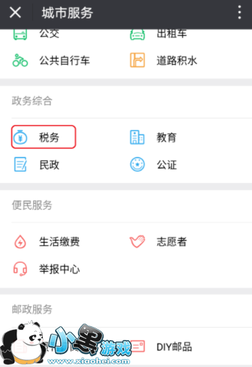 4.进入城市服务界面后,如果没有给服务定位的权限或定位的城市不对,则先手动更改城市(点击城市项就可以选择);然后向上划屏幕,找到“政务综合”分类,在其中有一项“税务”的功能,选择即可