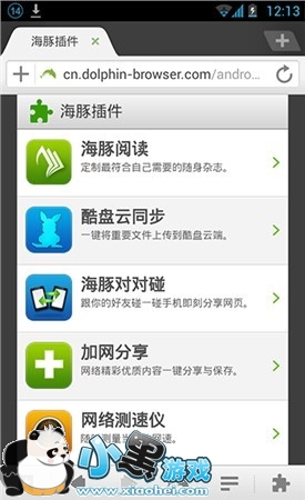 在手机上支持插件的浏览器并不多,除了火狐和谷歌浏览器之外海豚也是一个。当然在国内本土化结合方面海豚浏览器却比任何一家都要做得好。其次在一些常用的社交软件交互方面,海豚的支持也是最完美的。