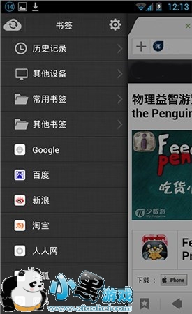 侧边栏菜单侧边栏算是现在非常流行的交互设计了,海豚支持双侧边栏,而且功能的设置非常合理,易用性很高。左侧边栏为书签栏,可以在那里查看和管理书签(海豚的书签管理功能很棒),同时还有一键云同步的按钮,新版的云同步能,且仅能使用新浪微博帐号登陆,这点方便了一些人也麻烦了一些人。方便的地方在于现在新浪微博很流行,很多用户不必注册海豚帐号就能云同步,麻烦在于没有新浪微博帐号的用户须得注册新浪微博。浏览器的右侧边栏拉开为插件页,点击直接使用插件。