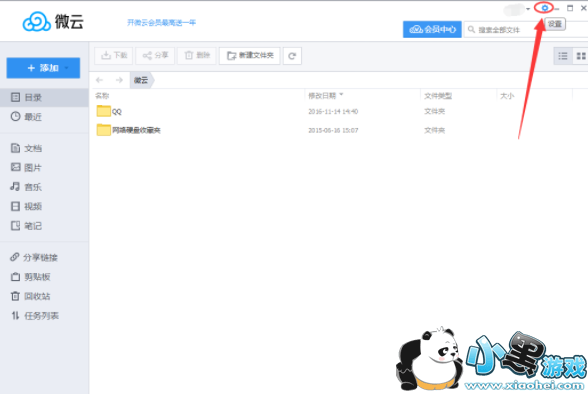 1、首先打开腾讯微云,然后在其右上角位置点击“设置”按钮;