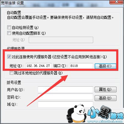 4、接着在打开的窗口中,勾选“为此连接设置代理服务器”项,同时输入代理服务器的IP地址及端口,点击“确定”即可。