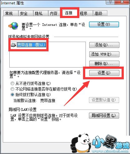 3、在打开的“Internet选项”窗口中,切换到“连接”选项卡,选中“宽带连接”项,点击“设置”按钮。