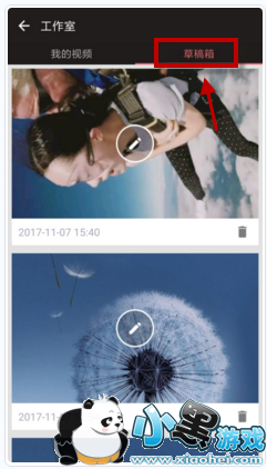 2.在上方栏中会显示有【我的视频】和【草稿箱】。其中【我的视频】是确定保存的视频,而【草稿箱】则是所有处理过但是未保存的视频,点击对应目的片段,则可读取并进行剪辑操作。