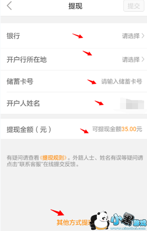 5. 提现。点击提现,银行卡提现的话填写相应信息和提现金额。也可以选择其他方式提现即支付宝提现。支付宝提现填写支付宝账号,姓名,金额。