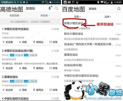 实际打开附近加油站一项后,却发现百度的数据又一次发生错误。如下图附近加油站中,百度竟然给出一个废旧的加油站。而高德地图中,这个位置并没有加油站。另外,我发现高德地图的加油站名称更符合我们当地的日常叫法。百度给出的加油站名称,就是当地人看了都有点糊涂。比如高德地图的中国石化桂中加油站(实际加油站名称就是这样写的),在百度地图里却叫柳北沙塘加油站。