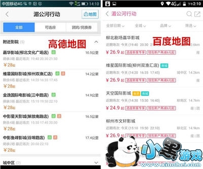 检测完加油站后,我又看了看电影服务类。这回百度的O2O领域整合优势就显现出来了。在下图中,对于相同电影院相同时段的《湄公河行动》为例,高德地图上的电影票价普遍要比百度地图的电影票价贵。估计这是由于百度自有O2O平台百度糯米的优势,而高德地图的O2O生活服务类要接入第三方平台。
