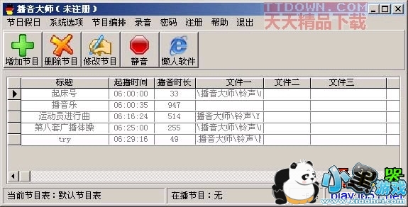 《播音大师》是一个可以定时开机、定时播放声音(音乐)、定时关机的全自动播音软件软件,其最大特点是可以控制播音时间的长短,可以设定节假日(如星期六、日,1月1日)不播音等。适用于:学校、公司、工厂等单位用于作息时间的自动控制,可取代传统的电铃、人工广播的作用;舞厅、商场、酒店等公共场所的背景音乐的播放,完全不须人工干预;个人、办公室用于播放背景音乐、定时提醒。