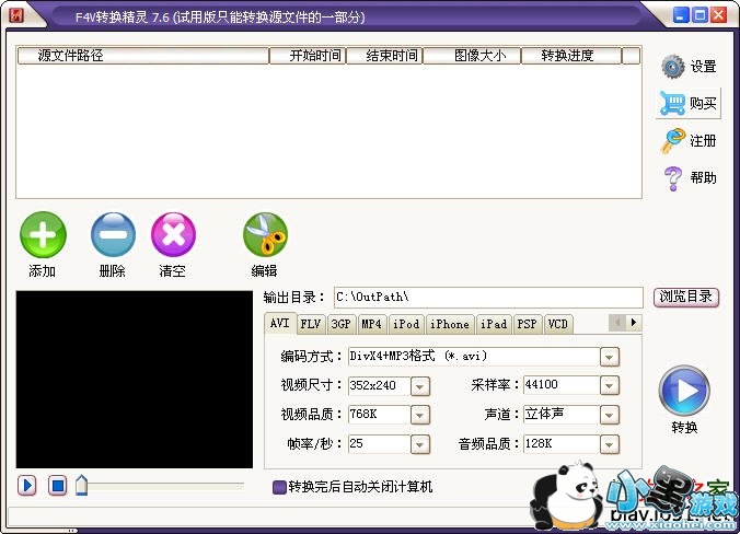 F4V转换精灵 还拥有操作简易的视频编辑功能,可以指定时间对视频进行截取,可以播放预览视频对图像进行裁剪,还可以调节视频亮度、对比度、饱和度、加入视频特效、抓取精彩视频图片等人性化功能。