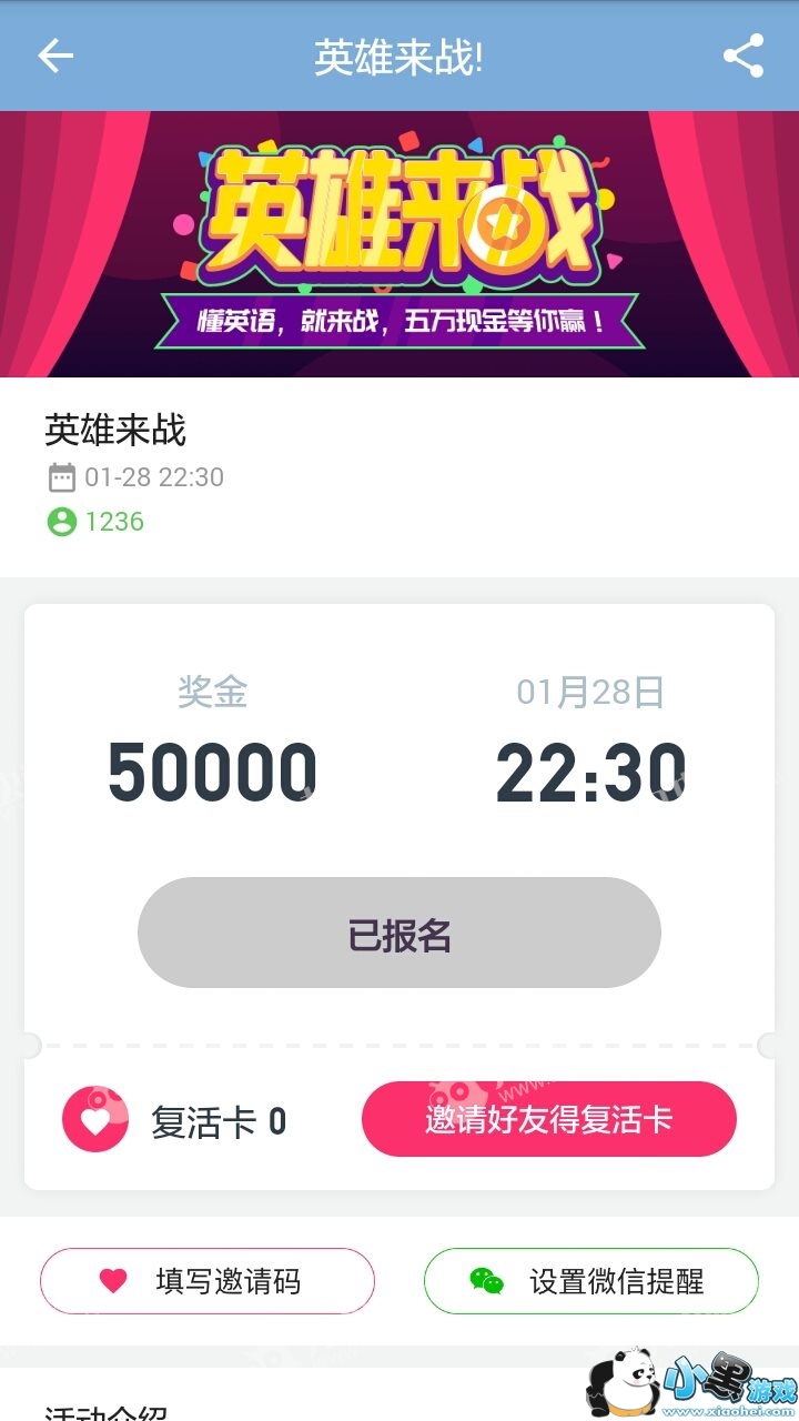 每成功邀请一位好友参加(填写邀请码),你与好友可分别获得一张复活卡,使用复活卡可将答错题自动变为答对题!