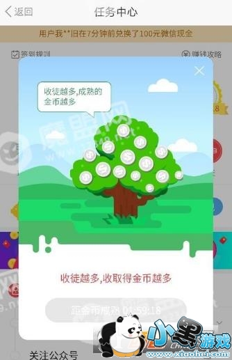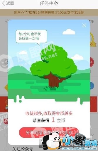 右下角还有“任务中心”,就是图标识位置,你可以点击一下。首先看到的是金币大树,3小时成熟一次,点击一下,成熟的果子会掉落,落地就成了金币,你可以领取到,并且可以分享朋友圈,会多赚18金币,只要有空你就看看,很快金币果子又成熟了。
