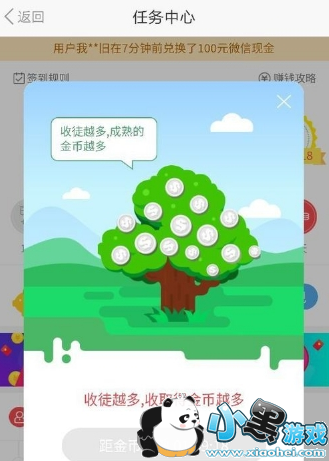 右下角还有“任务中心”,就是图标识位置,你可以点击一下。首先看到的是金币大树,3小时成熟一次,点击一下,成熟的果子会掉落,落地就成了金币,你可以领取到,并且可以分享朋友圈,会多赚18金币,只要有空你就看看,很快金币果子又成熟了。