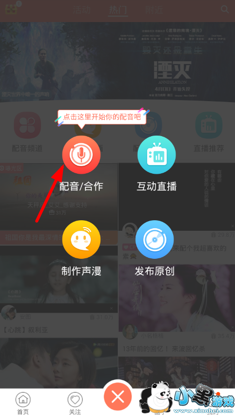1、大家若是想要通过配音秀来制作上传自己的素材,那么就需要先点击下方“+”选项,选择功能列表中的“配音/合作”功能,就可以去上传自己的素材了。