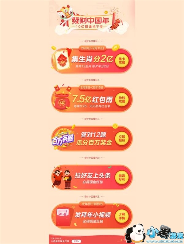 3. 7.5亿红包雨,游戏时间2/8-2/15日用户可在头条参与抢红包,红包开始时间为每天20:45,金额为5000万