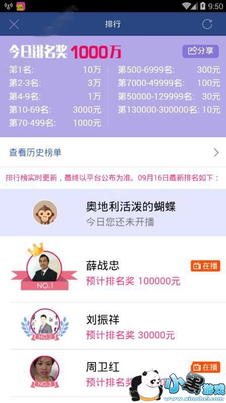 2、在“排行”页面我们可以看到每日主播排名,排行越高获得的收益就越多,即刻加入平台就能赚取丰厚收益哦;