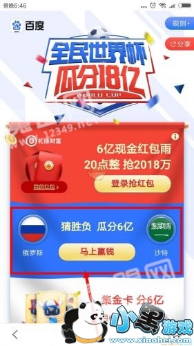 3、进入“全民世界杯杯 瓜分18亿”页面后,我们会看到“猜胜负瓜分6亿”的字样,点击进入即可!(如下图)