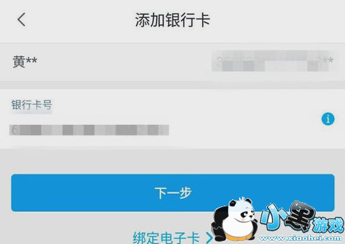 5、接着系统会显示我们的名字和身份证号码;会要求我们输入要添加的银行卡号码;输入号码后,点击“下一步”;