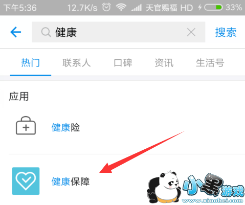 2.输入搜索健康,如图所示,点击下方的健康保障菜单应用。