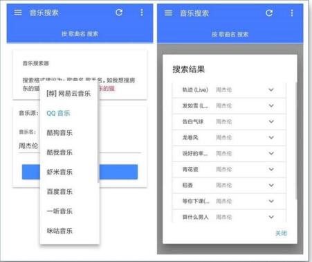 音乐搜索提供包括:网易云,QQ,酷狗,酷我,虾米,百度,咪咕等11个主流音乐搜索引擎。你可以任意切换搜索引擎,得到不同的结果。