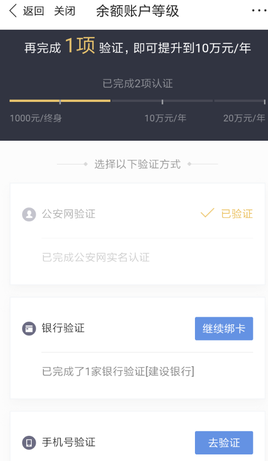 3、当前账号只要完成了实名认证、银行卡认证、手机号码验证,就可以成功升级到2级账号,额度也就相应的提升了!