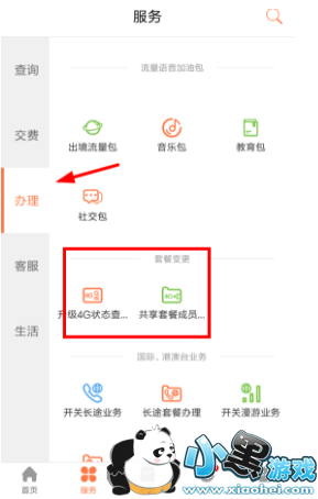 2、通过服务页面左侧的“办理”分类,我们就可以滑动找到所需的“套餐变更”功能了,非常方便快捷!