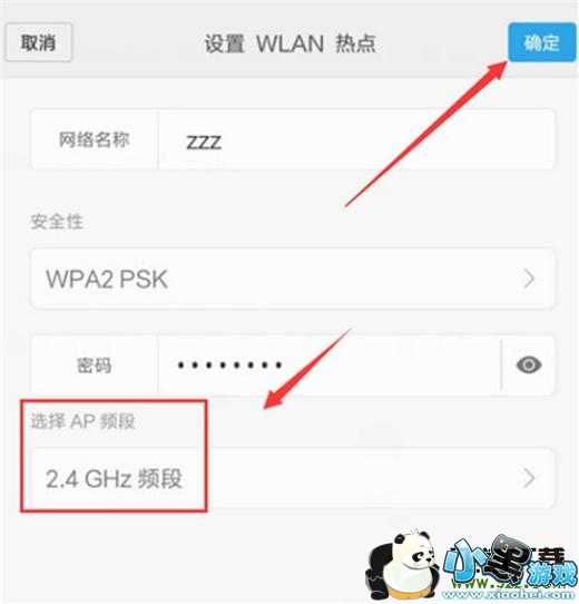 第五步:接着我们来设置热点的频段,这使得我们的热点更加的安全,有些手机是识别不了的,设置好之后点击右上角【确定】,如下图。