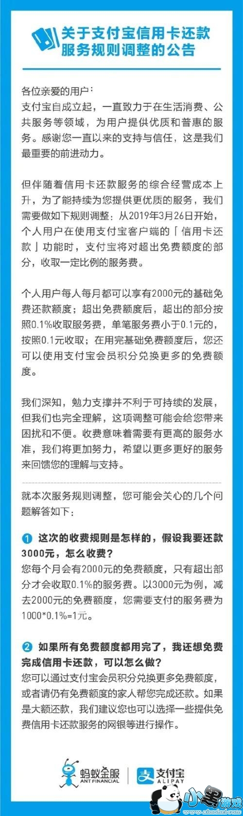 伴随着信用卡还款服务的综合经营成本上升,为了能持续提供更优质的服务,支付宝做如下规则调整:从2019年3月26日开始,个人用户在使用支付宝客户端的‘信用卡还款’功能时,支付宝将对超出免费额度的部分,收取一定比例的服务费。