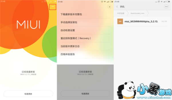 5、将手机同电脑连接,将 zip 包拷贝至内置存储 /downloaded_rom 文件夹下,或仅包含"英文或数字"路径的文件夹下,然后进入“系统更新”:MIUI 6/7/8/9:点右上角“...”选择“手动选择安装包” ,然后选择 zip 包。