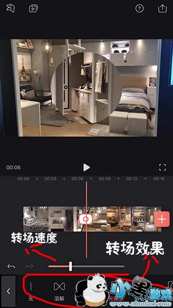 4、在底部就可以选择转场的效果,上面还可以调节转场的速度;
