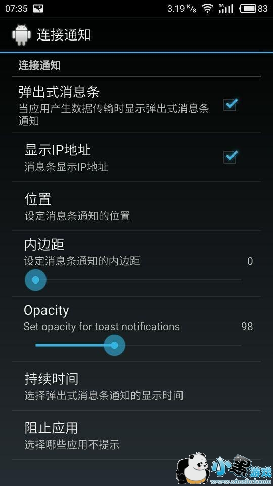 7.返回到“设置”,点击“ 连接通知”,将“弹出式信息条”和“ 显示IP地址”都打上钩钩,在打开“阻止应用”,