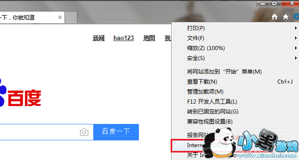 在电脑上打开浏览器,点击右上方的设置图标,选择Internet选项,如下图所示: