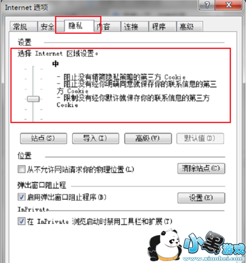 点击确定之后,点击隐私,在选择Internet区域设置下方将级别调为低或者中,如下图所示:
