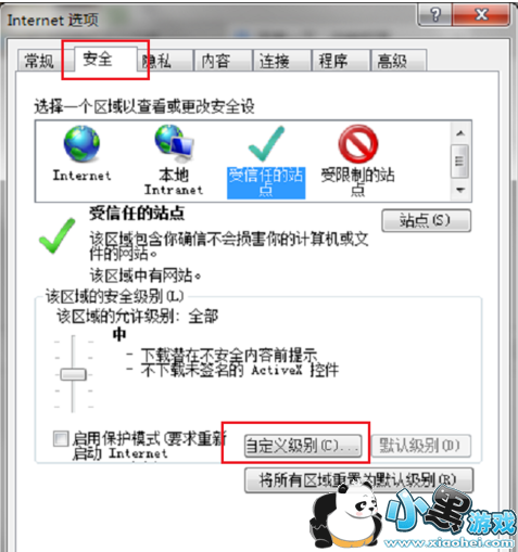 进去Internet选项界面之后,点击安全,选择下方的自定义级别,如下图所示: