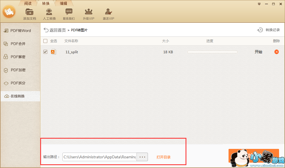 4、打开它后根据提示将想要转换的pdf文件拖动到该界面,之后选择一下输出路径,最后点击“开始转换”就可以了。