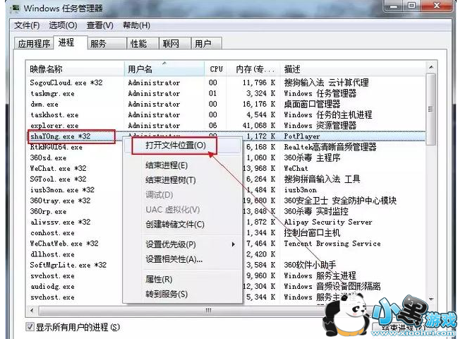 2、在进程里面找到关于PotPlayer这个软件的名字,按照正常先找它的映像名称,发现并没有这个软件,然后在描述里面终于发现它了,原来它的映像名称居然是shaUOng.exe,如下图:
