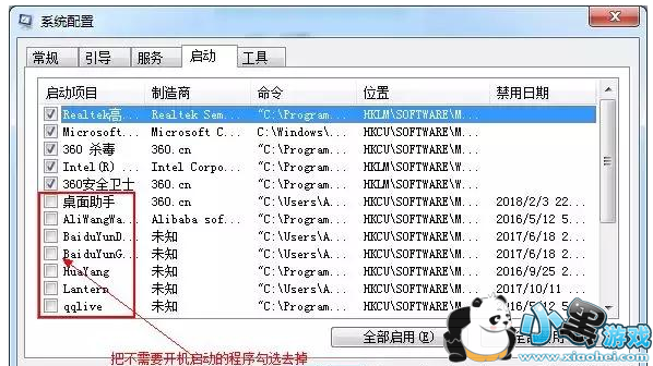 2、在启动里面把不需要开机启动的勾选掉。