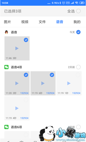 开启微痕迹后,可以看到“语音”一栏,其中能够找到QQ、微信当中收发过的语音。由于第三方APP没法读取QQ、微信的数据库,因此微痕迹APP当中的语音也只能简单显示文件名,而没法归类到具体是哪个人发送的哪一条语音。但所幸的是通过时间和长度,还是可以作初步判断,认准了你想要转发的语音后,选中它,然后不要直接发送,而是选择导出,之后语音就能够被导出为普通的音频文件了。