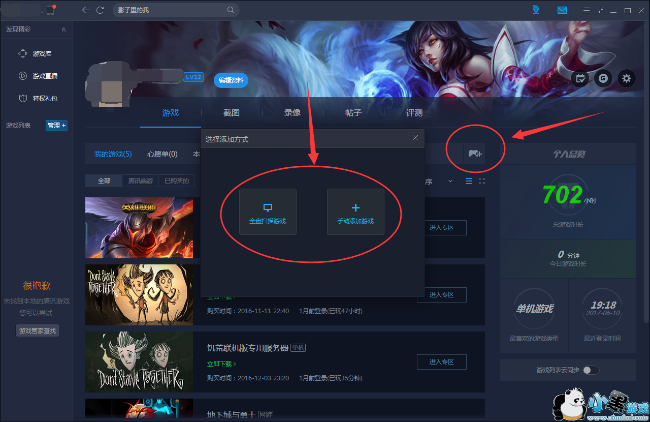 3、接着找到DNF并将其添加到游戏列表中,或者也可以通过扫描电脑的方式添加,如下图所示: