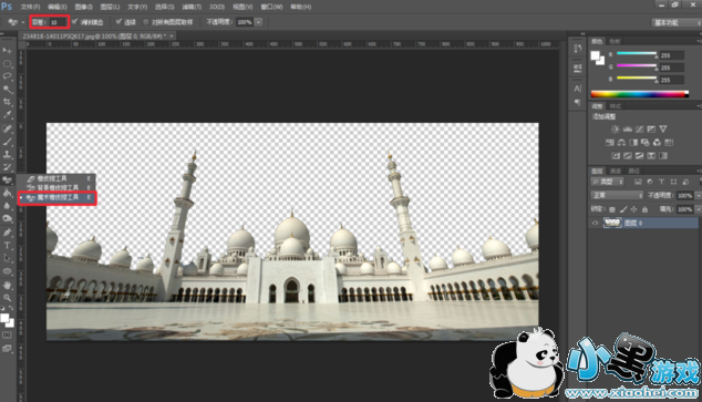 打开Photoshop软件,导入图片,选择“魔术橡皮擦工具”,在顶部工具栏中设置容差值(容差越大,范围越广),再点击需要去除的图片区域。