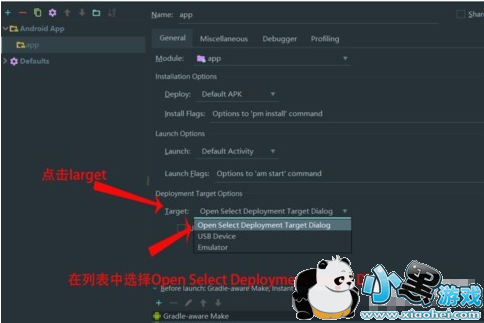 6、需要再次使用Android Studio自带的模拟器时,重新进入Run/Debug Configurations窗口下,点击Iarget,在列表中选择Open Select Deployment Target Dlalog即可。