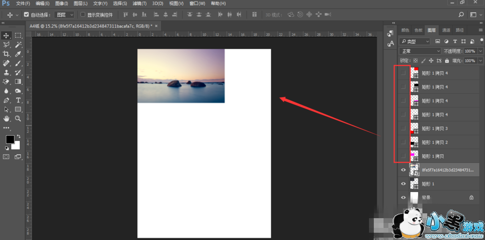 选择一张图片拖入画布中,这时新拖入的图片图层是在整个矩形图层的上方。