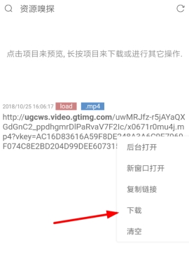 3、等到yoo视频的资源嗅探完毕,通过长按链接唤起功能列表,使用Via浏览器来下载视频文件。