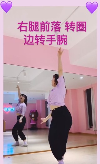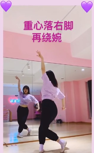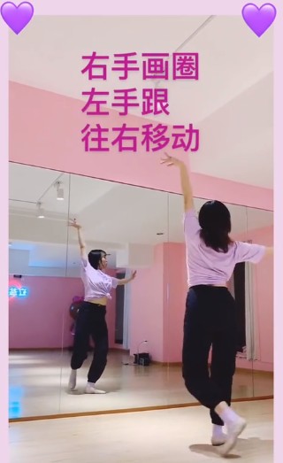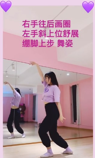 9.右手往后画圈,左手斜上位舒展,绷脚上步,舞姿。