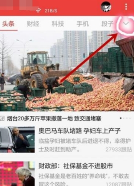 1、首先打开APP,可以看到当天的实时新闻,点击主界面右侧的向下的角标。