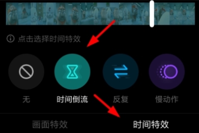2、选择右上角的“特效”功能,在“时间特效”中选择“时间倒流”功能。