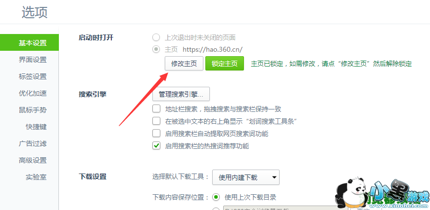 2、在选项界面的“基本设置”中点击“修改主页”。